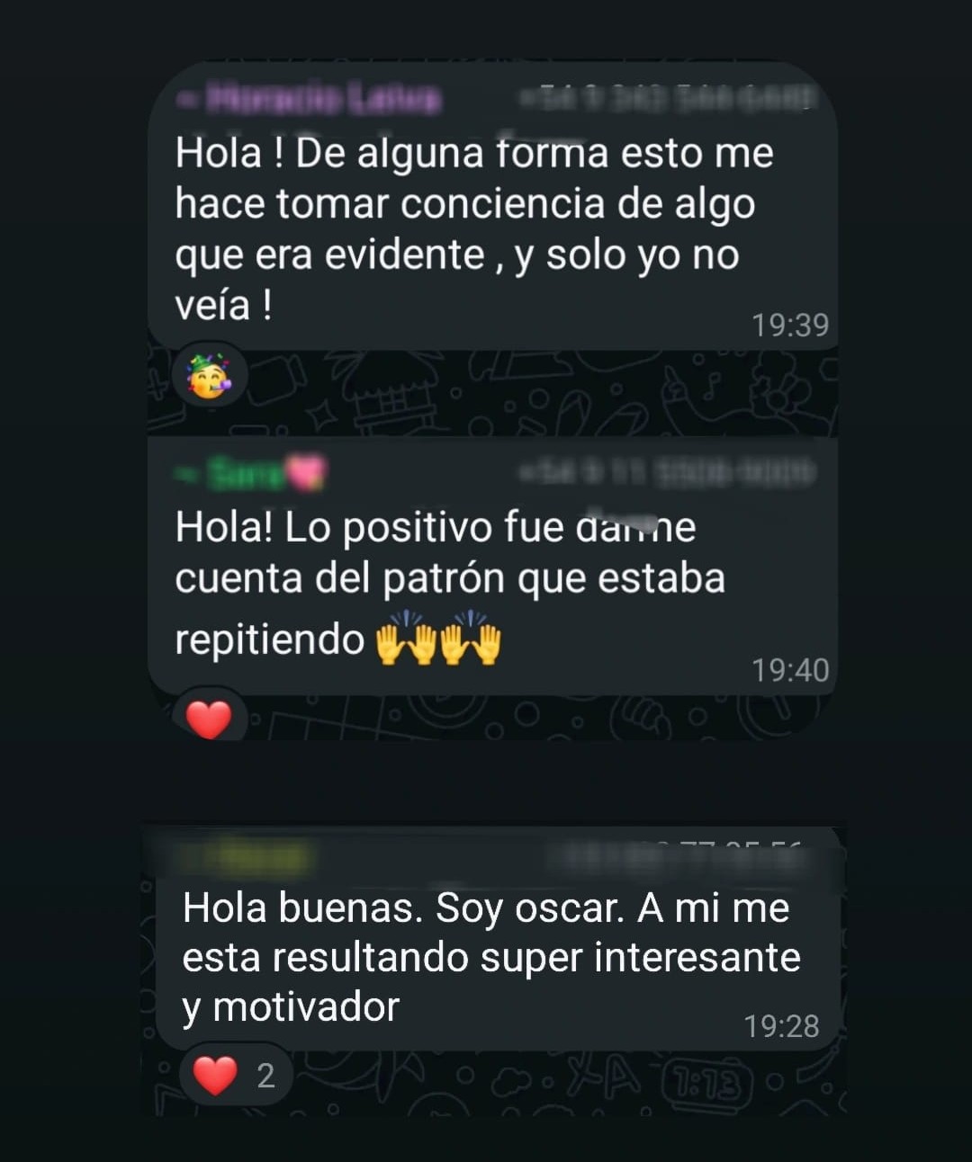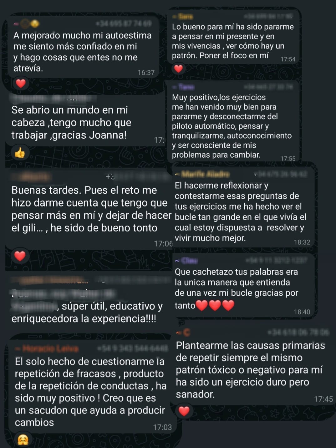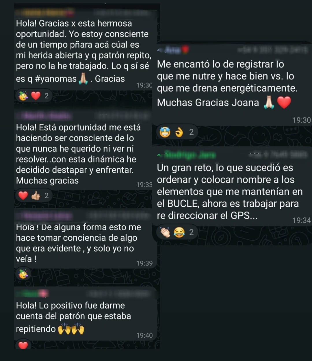 En una semana he aprendido conceptos claves y herramientas , salir de la zona de confort, herramientas para buscar nuevos amigos y entornos parecidos a mis intereses, herramientas para desenvolvernos mejor con otras personas y nuestros amigos, todo esto necesario para ser más atractivo para parejas y otras personas la importancia de la formación continuada y conocer a Joana perlas que no tienen precio , gracias por todo .